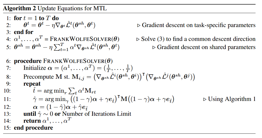 先梯度下降更新 任务自己的网络参数θt ,然后使用Frank-Wolfe算法求解得到合适的α,通过加权更新共享网络参数θsh.