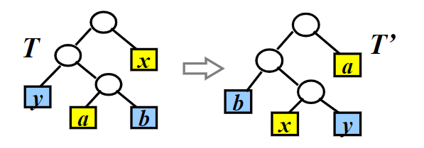 当x . f r e q ≠ b . f r e q x.freq\neq b.freq x . f re q = b . f re q 时,即x ≠ b x\neq b x = b 时,我们将x , a x,a x , a 进行交换,得到区别于T T T 的新树T ′ T' T ′ ,将y , b y,b y , b 进行交换,得到区别于T ′ T' T ′ 的新树T ′ ′ T'' T ′′ . (注:如果x = b , y ≠ a x=b,y\neq a x = b , y = a 那么上面的这个交换方法得到的T ′ ′ T'' T ′′ 中,x , y x,y x , y 不是兄弟结点,即不会出现只有最后一位不等的情况) 于是: