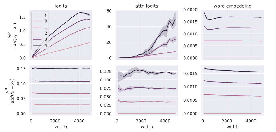 在利用 Transformer 模型做1 次到 5 次的更新的实验可以进一步说明该问题。与输入宽度有关是输出值 logits, attn logits 使用 SP 方法都产生了爆炸,而 μP 则相对很稳定。其中,word embedding 是与宽度无关的层,所以二者都比较稳定。