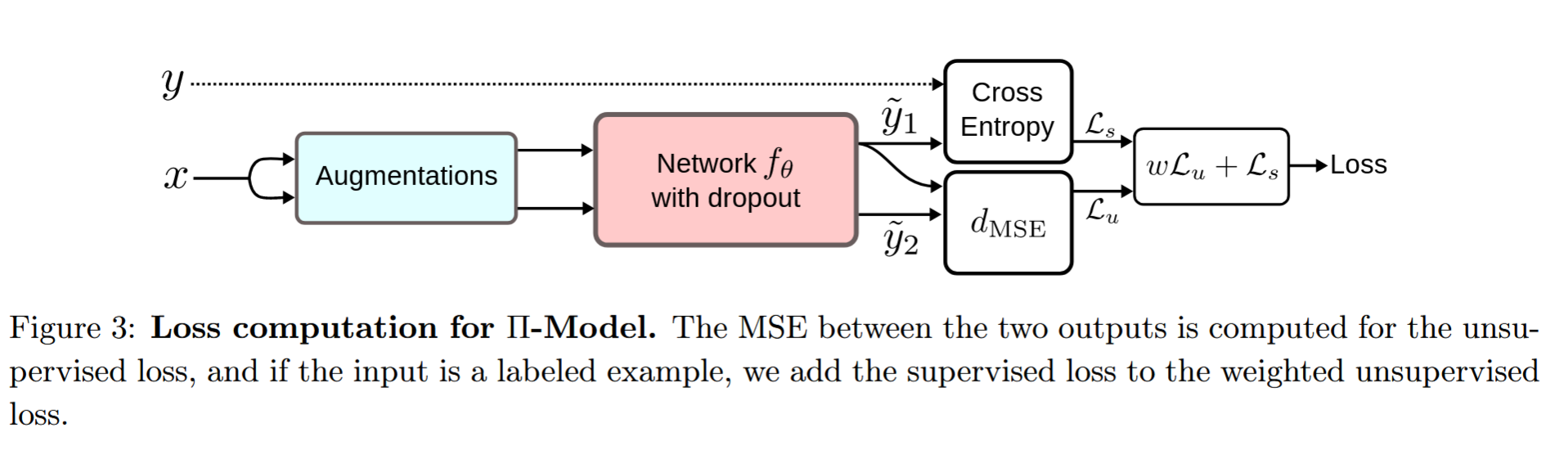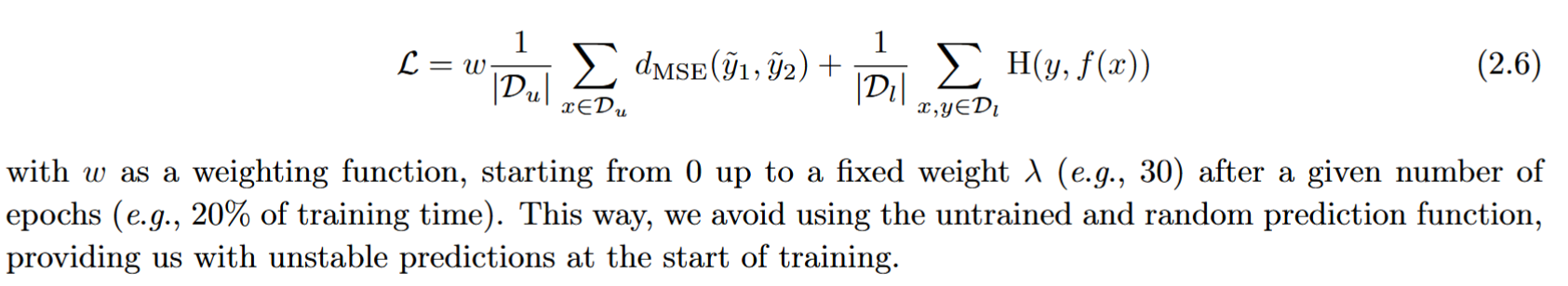 注意,这里的 是输入 在上一次迭代(上一个 epoch 而不是上一批 batch )的输出结果,所以其实是同一个输入样本的输出,只是因为经过一轮训练和随机扰动之后,输出结果可能不一样了,但是因为来自同一个样本,并且基于一致性假设,它们之间还是应该尽可能接近的。