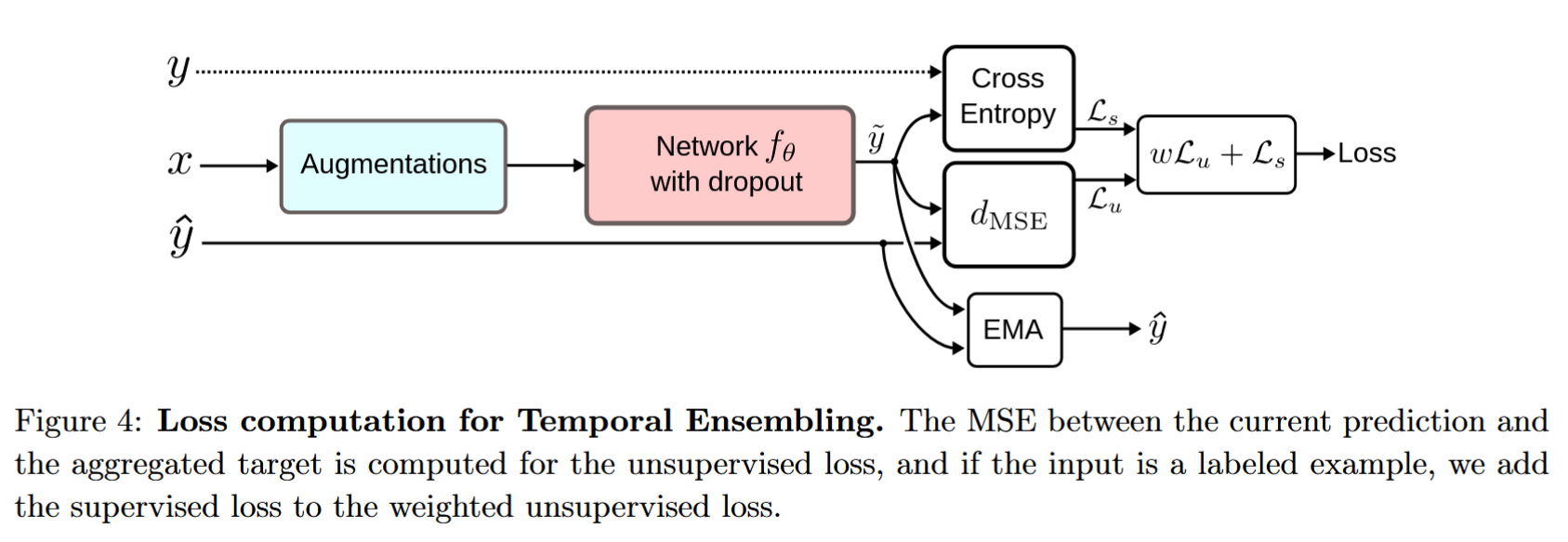 为解决这个问题,Π-Model 的原作者其实已经在同一篇论文里给出了他的方案,提出了Temporal Ensembling。如图所示,Temporal Ensembling 在