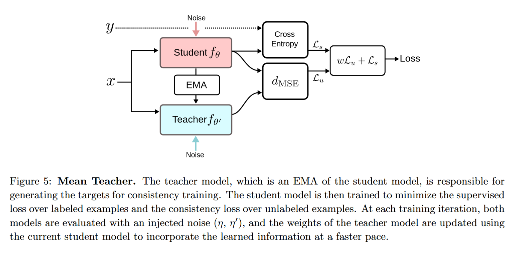 代理标签法:在未标记数据上生成 proxy-label,并将其与有标注数据共同使用。这些标签是模型本身或其变体生成的,无需额外监督——这意味着它们可能并不能反映事实,是嘈杂的、微弱的,但我们还是能从中提取到一些有用的学习信号。
