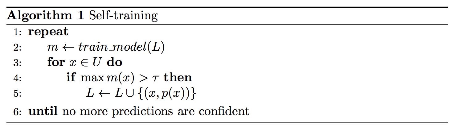 1995年,Yarowsky等人提出 Self-training 算法,被视为半监督学习的基本雏形。顾名思义,Self-training就是在已有标签基础上,让模型对无标签数据进行分类,然后再把分类预测用于训练,并从中获取额外信息。