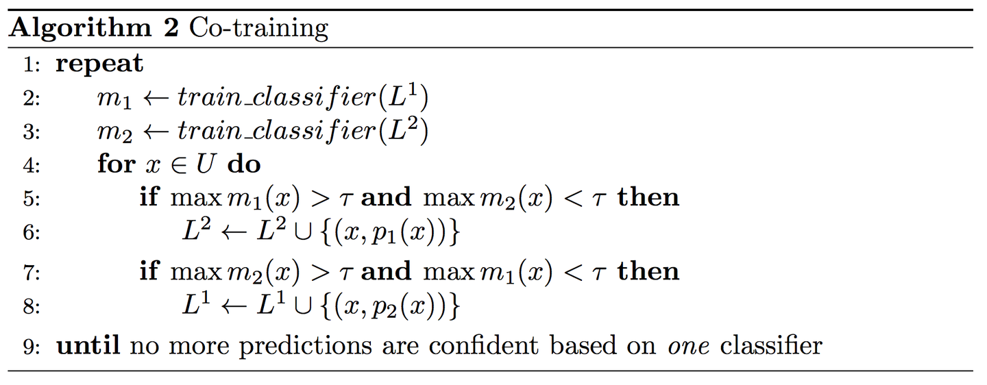 1998年,CMU 的 Blum 和 Mitchell 在论文 《Combining Labeled and Unlabeled Data with Co-Training》中首次提出Co-training概念。这是多角度训练的一个经典算法,也提出了相对较强的假设:数据 可以被两个条件独立的特征集 和 表示,且每个特征集都能够训练出一个强学习器 和。在训练时,一个模型会为另一个模型的输入提供代理标签,如下图所示。