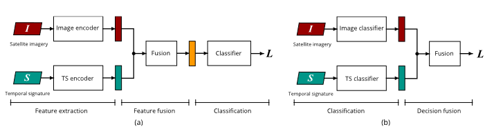 对于一个区域(Region)Ri\cal R_i,给定该区域的卫星遥感图像Ii\boldsymbol I_i 、社会感知信号Si\boldsymbol S_i 以及该区域所属的类别ciC={ckk=1,2,,n}c_i\in C=\{c_k|k=1,2,\cdots,n\} ,我们的目标是根据遥感和社会感知数据对区域类别进行预测,即通过某种方法计算得到该区域属于类别ckc_k 的概率,将概率最高的类别cic_i^* 视为预测结果: