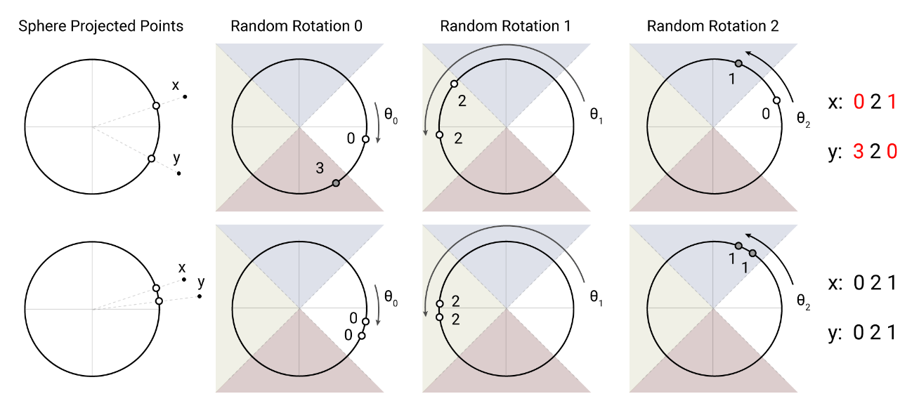 Reformer 引入了 Angular LSH 来构造哈希,简单来说就是把d d d 维空间上的点投影到单位球上,球被预先划分好了多个区域。然后对点进行随机旋转之后,这些点所属的区域编号就是其对应的桶。